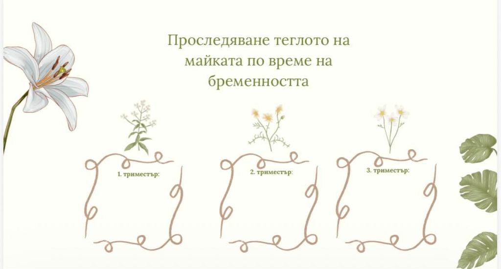 Тук може да разгледате няколко странички от дневника, за да прецените дали Ви харесва той. Дизайнът е с флорални мотиви в неутрални цветове – подходящ както за мами, които очакват момченца, така и за такива, които чакат момиченца.