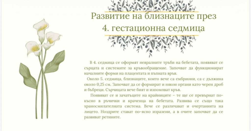 А ето така изглеждат и страничките с развитието на близнаците по време на бремеността. Промените са разгледани подробно до 32. гестационна седмица, като след това е дадена обща информация какво да се очаква до края на бременността, който обикновено е около 36-37 гестационна седмица.